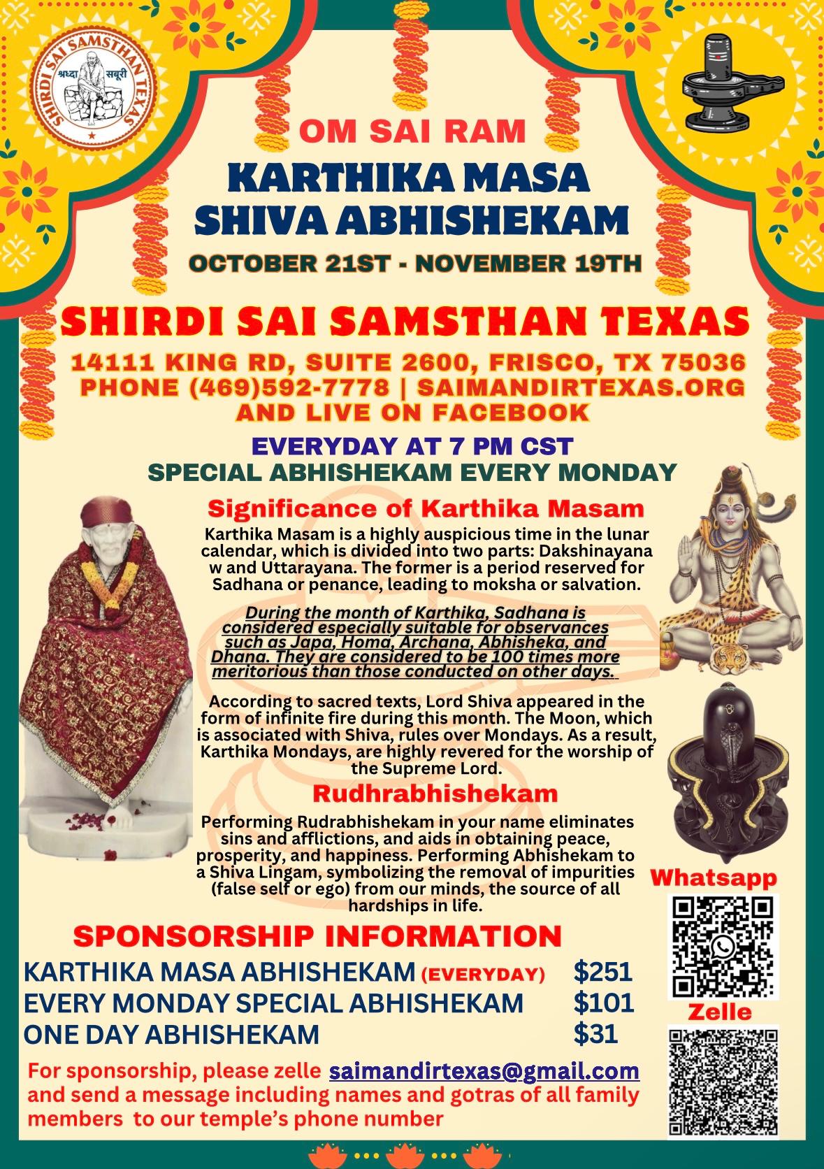 🌺Oct-9th Thursday Sankata Hara Chaturdhi 🌺 🌺Oct-18th Saturday Shani Trayodasi 🌺 🌺 Oct-20th Monday Diwali 🌺 🌺 Oct-21st Kathika masam starts🌺 🌺 Oct-25th Nagula Chavithi 🌺 🌺 Nov-4th Karthika Pournami🌺 🌺 Nov-8th Sankata Hara Chaturdhi 🌺 📍 Shirdi Sai Samsthan Texas 14111 King Rd, Suite 2600, Frisco, TX 75036 📞 (469)-592-7778 🌐 www.saimandirtexas.org We warmly welcome all devotees with family & friends to join these sacred celebrations and receive Baba’s blessings.